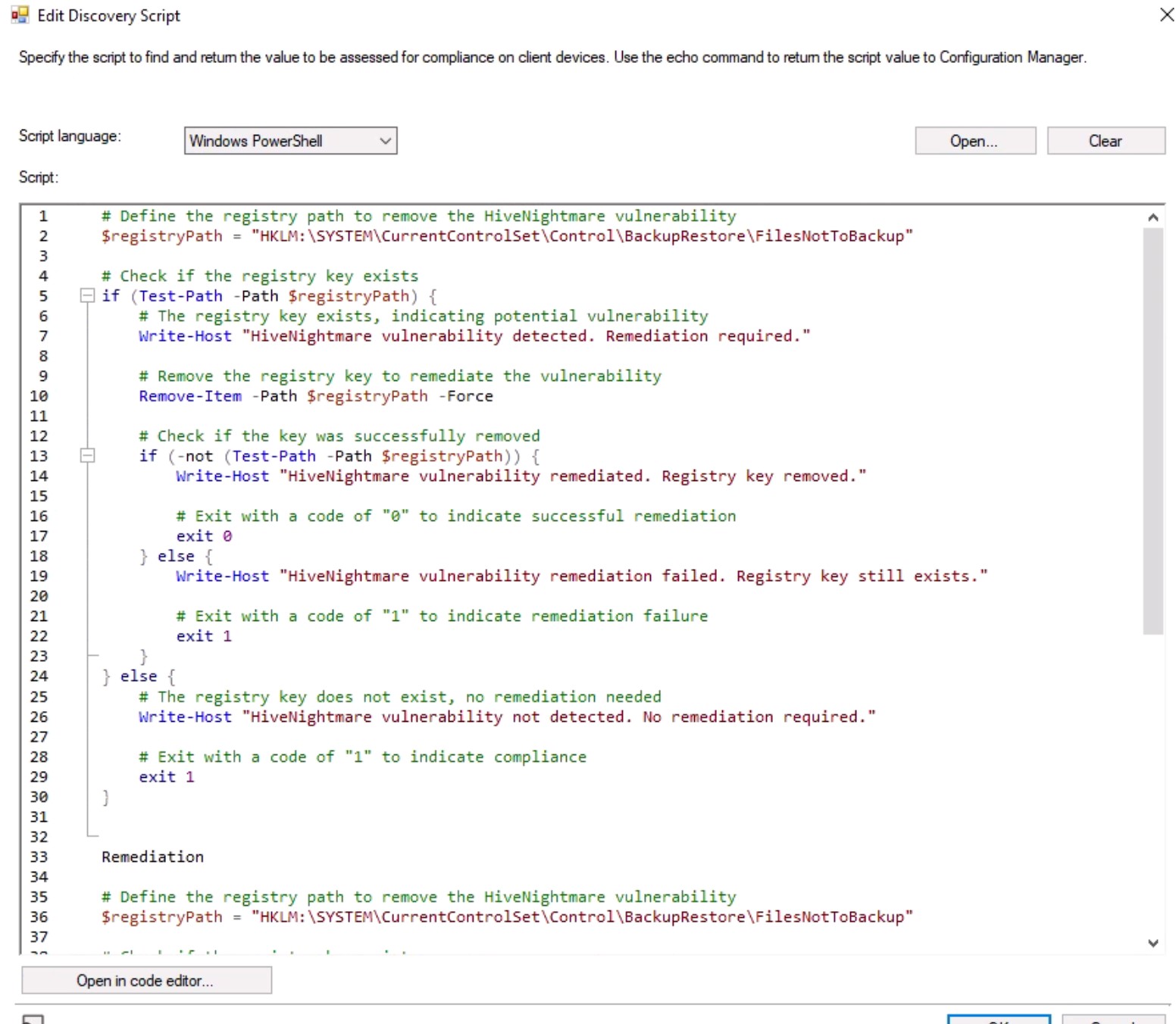 - Creating a Configuration Item involving scripting to detect and remediate the HiveNightmare vulnerability.